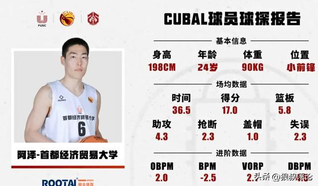 阿泽曾是首经贸核心,累积贡献(VORP)同位置前十,出色的体型和协防意识,防守端存在感很强,进攻端是能扛起很高球权的乱战型得分手。