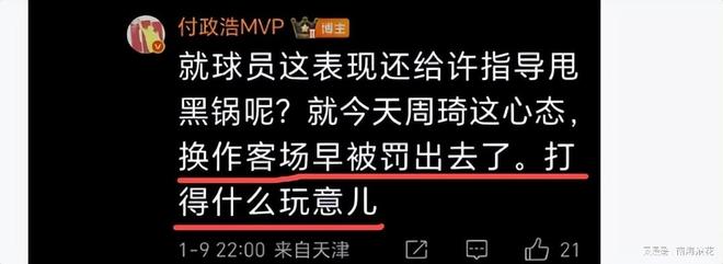 除了攻守不给力,还搞乱全队情绪,与陶汉林较劲,与珀赛尔对喷,骂骂咧咧,双方都领了技术犯规,遭隔扣太尴尬了。媒体人付政浩毫不留情的批评了他,“就球员这表现还给许指导甩黑锅呢?就今天周琦这心态,换作客场早被罚出去了。打得什么玩意儿。”