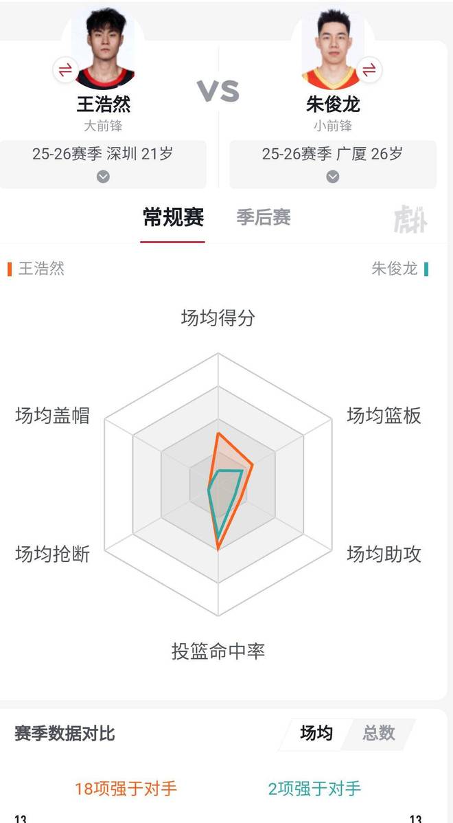 和张镇麟相比,王浩然也有16项数据强于对手,再来和朱俊龙对比,王浩然更是全面碾压。