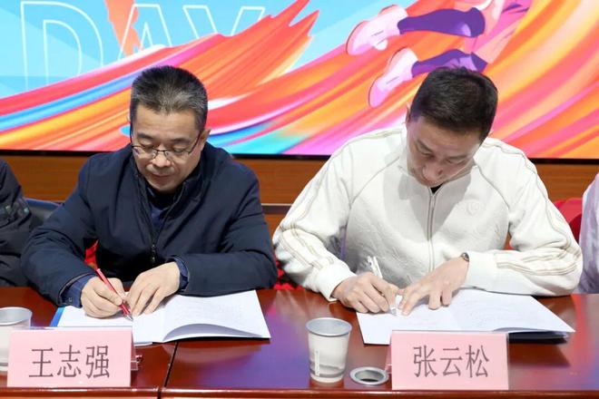 签约仪式上,北京首钢篮球俱乐部总经理张云松、昌平二中教育集团回龙观校区执行校长金秀荣先后致辞,表达了对此次合作的殷切期待与坚定信心。随后,昌平二中教育集团总校长王志强与俱乐部总经理张云松共同签署共建合作协议,正式敲定双方合作关系。