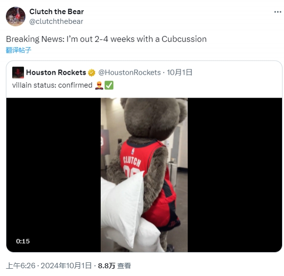 随后火箭熊在社媒官宣,将因脑震荡缺席2-4周。