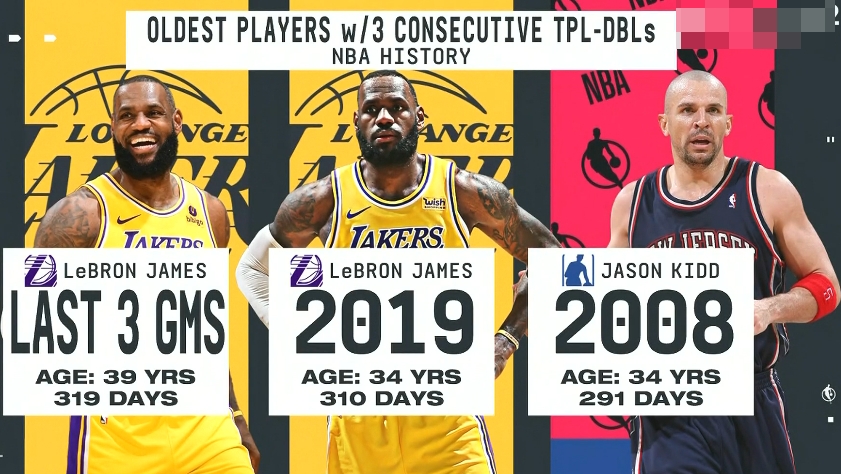 这是詹姆斯本赛季的第4次三双,也是他生涯的第40次30+三双,同时他也再次刷新NBA历史连续三场比赛拿下三双的球员的最老年龄(39岁319天,此前是34岁310天的自己)。