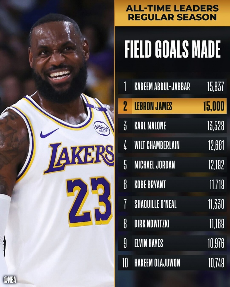 10、詹姆斯运动战进球数达15000个,历史第二、仅次于贾巴尔
