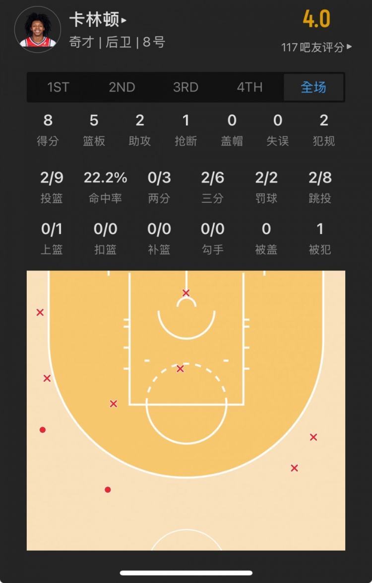 奇才14号秀 卡尔顿-卡林顿 登场33.8分钟