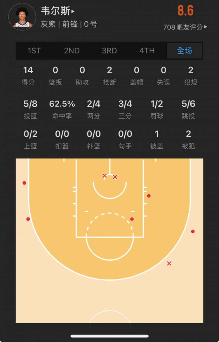 灰熊39号秀 杰伦-韦尔斯 登场30.0分钟