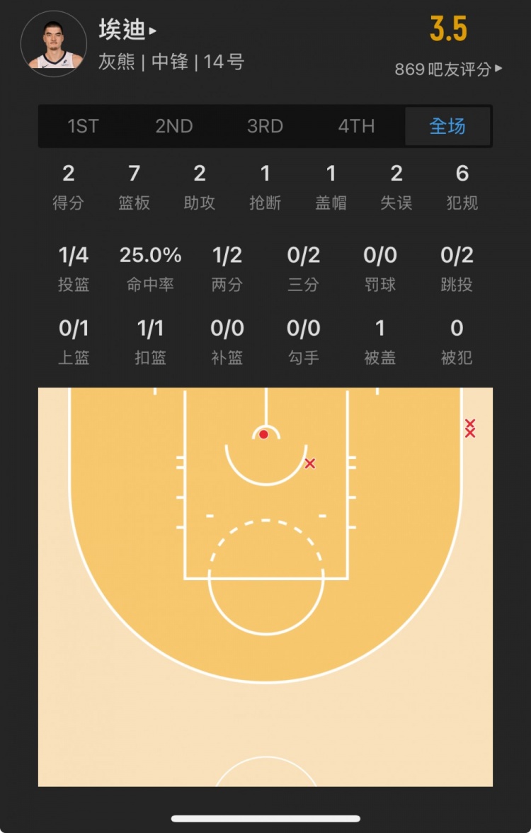 灰熊9号秀 扎克-埃迪 登场23.6分钟