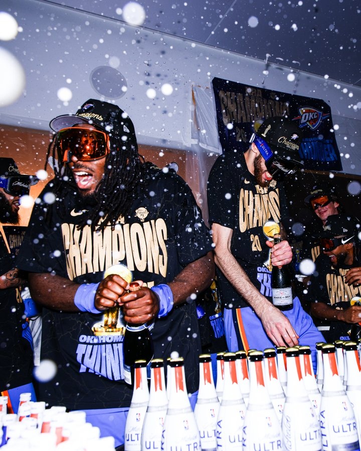 赛后,雷霆官推晒出了队员们在更衣室庆祝夺冠的图片。