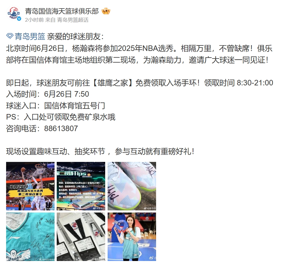 06月23日报道 青岛官方今日对青岛球迷做出邀约,邀请球迷在6月26日来到青岛男篮主场,参与见证杨瀚森选秀的活动。