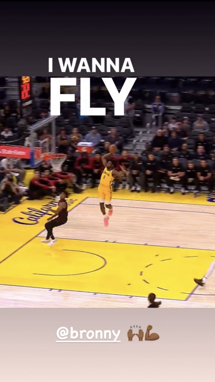7月8日报道 今日,湖人前锋詹姆斯更新Instagram Story,转发一张他的儿子布朗尼在加州经典夏季联赛中的快攻扣篮照。