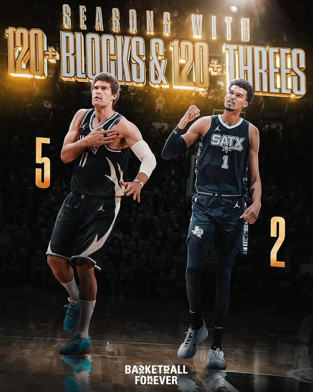 单赛季同时达成120+三分和盖帽:大洛5次,文班2次,此外没人能多次做到。