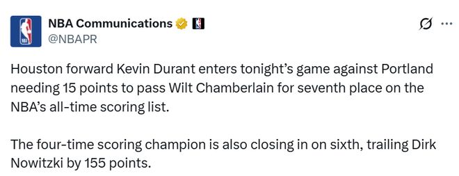 北京时间1月10日,杜兰特即将解锁另一座里程碑,只需再得到15分,杜兰特就能超越威尔特-张伯伦,跻身NBA历史得分榜第七位。NBA官方已经提前预热这一里程碑。