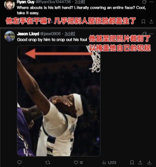别说他们了,哪怕联盟的普通球员,例如杨瀚森遭遇到了一些裁判的针对判罚,他也顶多是场上抱怨一下,小杨也不可能赛后跑到推特上发一条自己没犯规的图,真干不出这种事来。而且更重要的是,他发布的自己疑似被打手的这张图,是雄鹿官方推特的截图,他甚至还只截了一部分,他是发了一张裁剪之后断章取义的图,来证明自己好像被裁判针对了。