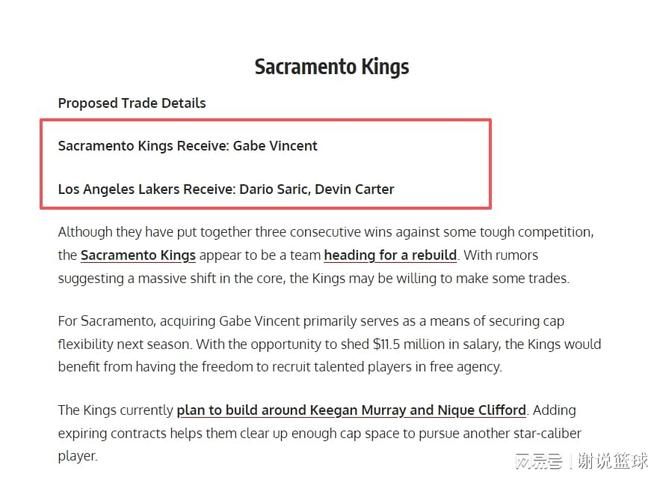 媒体FW支招湖人,应该考虑做1换2交易,可以送替补后卫盖布-文森特去国王。而具体交易方案里,湖人除了得到老将达里奥-萨里奇,还可以尝试捡漏后卫德文-卡特,他在国王确实境遇不佳。