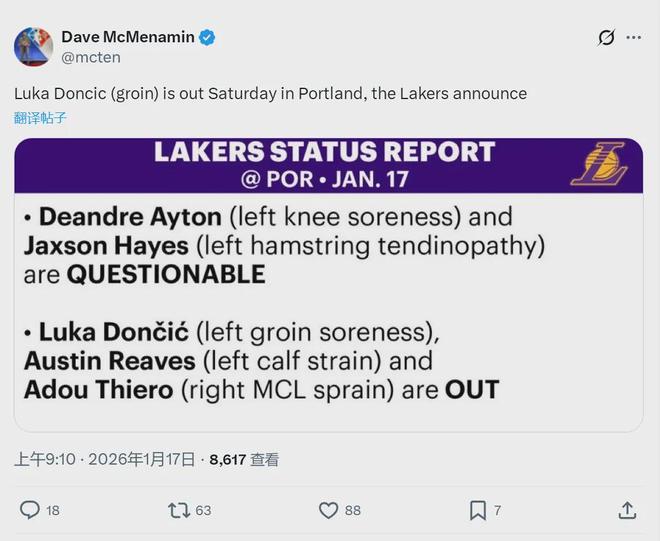 北京时间1月17日上午9点,湖人官方公布球队伤病报告:东契奇(腹股沟酸痛)、里夫斯(左小腿拉伤)、蒂耶罗(右膝韧带扭伤),将缺席明天和开拓者的比赛。此外,艾顿(左膝酸痛)和海斯(左腿筋肌腱炎)均是出战成疑。
