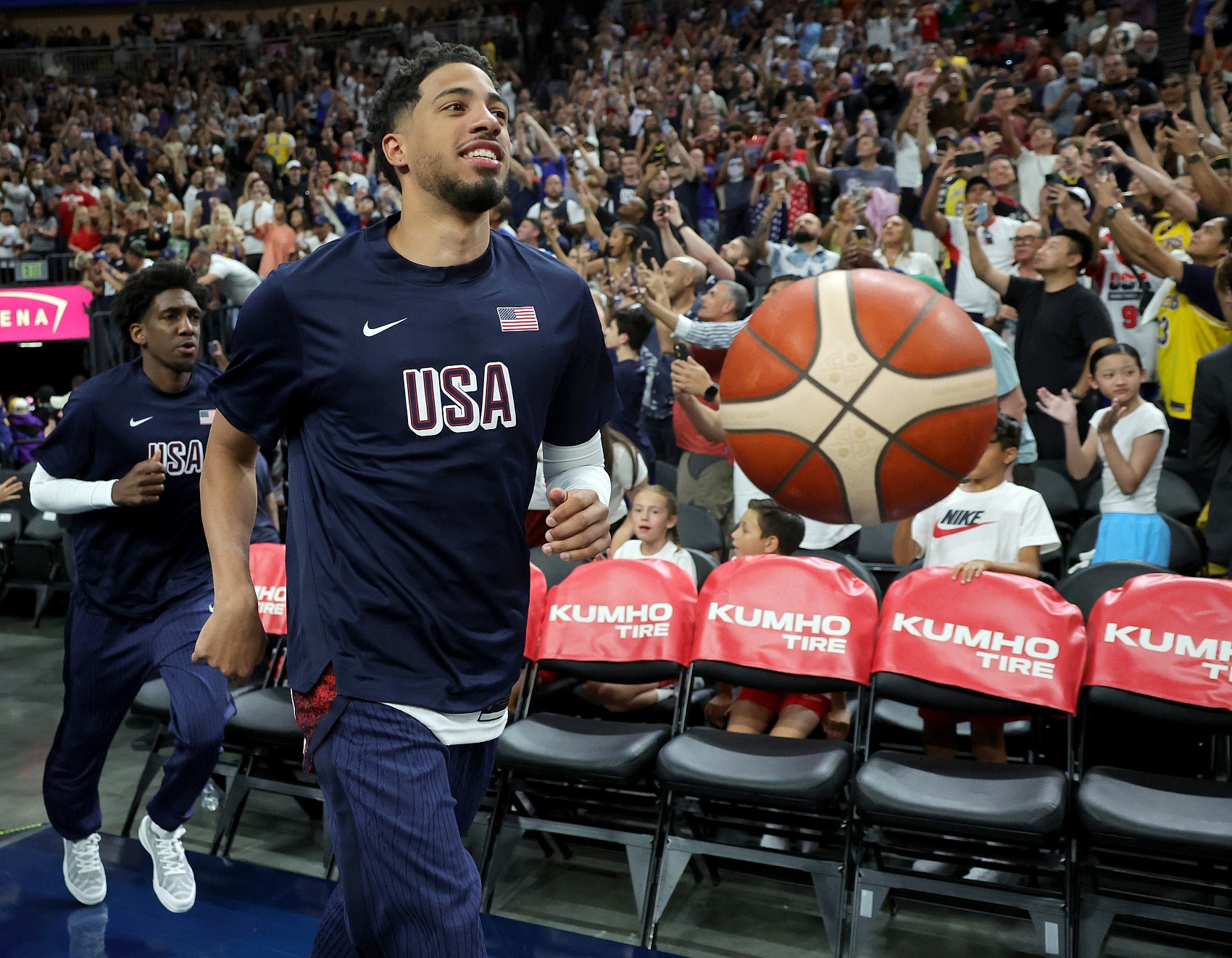 泰瑞斯-哈利伯顿穿过百乐宫酒店的大厅,走向门口等候他的汽车,这时一阵杂音响起。排队买冰淇淋的游客中,排在第一位的人率先抬起头,他指着朋友们,小声议论这位24岁的步行者队球星。哈利伯顿穿着红白蓝三色袖子的Starter夹克,外套背面刺绣着一只坐在奥运五环上的老鹰。在奇胡利的天花板旁,杜兰特戴着兜帽走向另一个方向,然后上了哈利伯顿的车上打盹。当哈利伯顿还在上中学的时候,杜兰特已经是联盟的主角了。他肯定会成为名人堂成员,但在今夏,他们在同一起跑线上,在巴黎一起为美国男篮争夺奥运金牌。