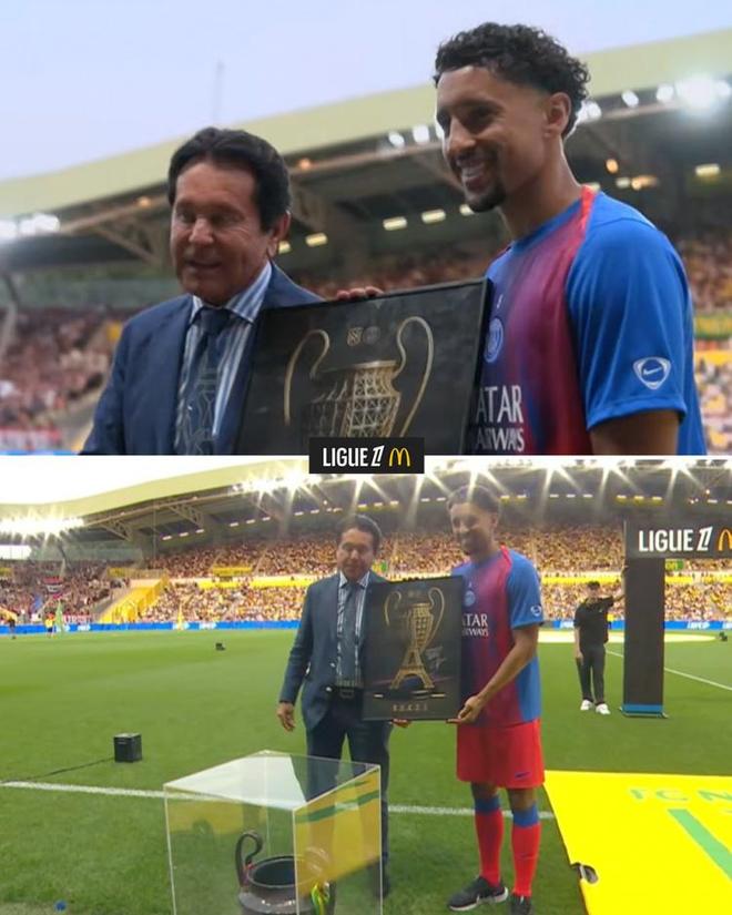 巴黎是上赛季的欧冠冠军,南特赠送的礼物上画有一座以巴黎铁塔为底座的大耳朵杯。