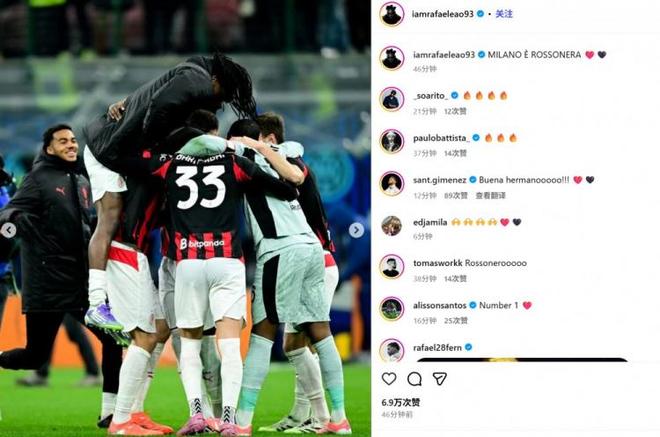 他也在赛后通过社媒晒出自己和队友们相拥庆祝的照片,并配文:“米兰城是红黑色的!”