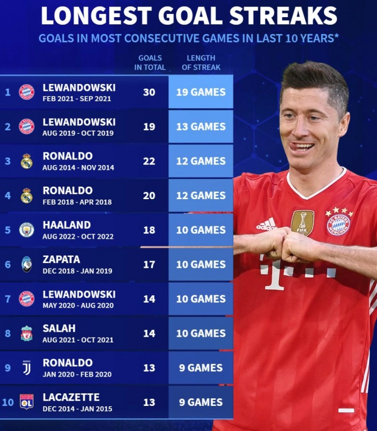 12月22日报道 《转会市场》统计了近10年效力五大联赛球员各项赛事连续破门情况,莱万居首并三度上榜。