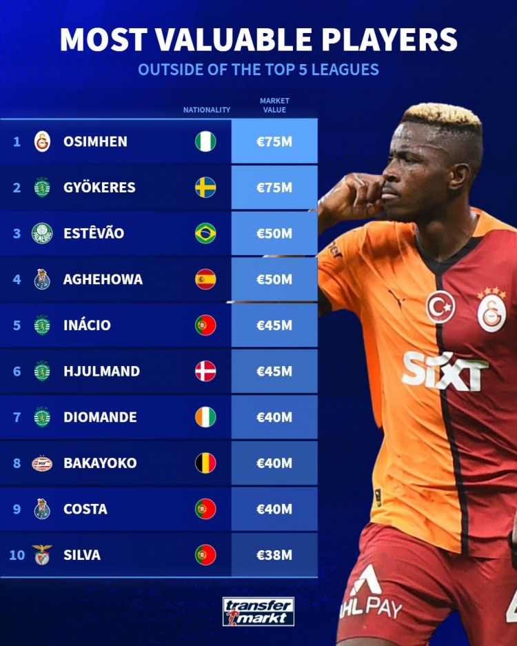 1月1日报道 德国转会市场统计了非五大联赛球员身价榜,奥斯梅恩7500万欧元排名第一。