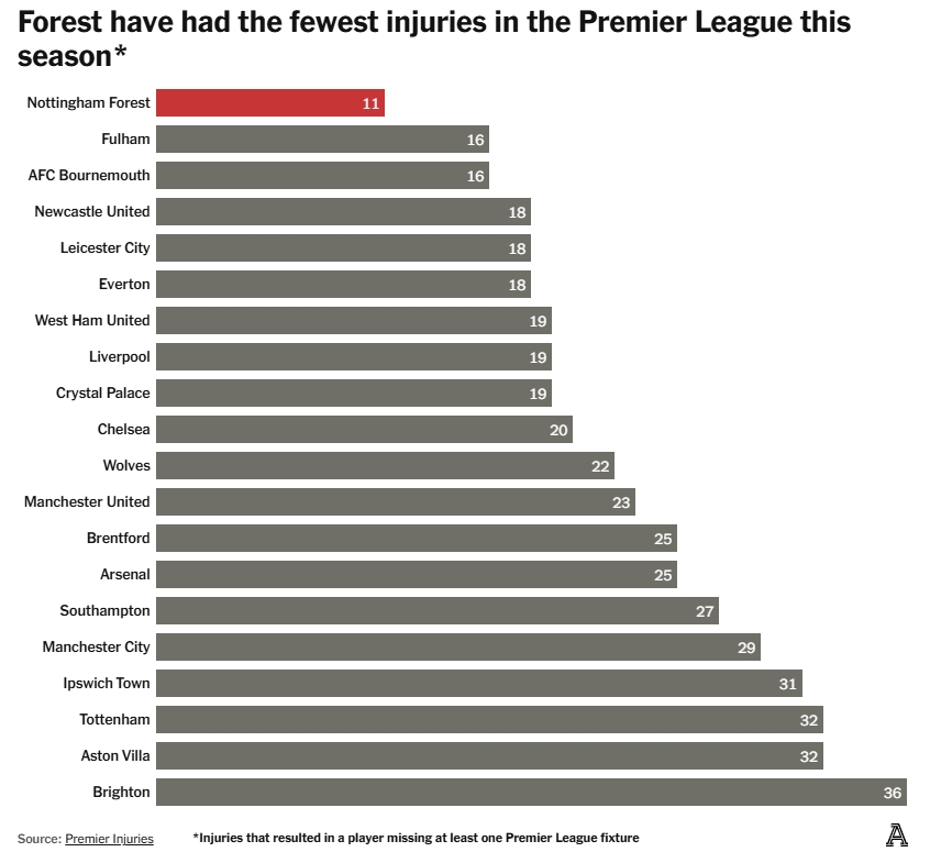 03月27日报道 《The Athletic》撰文分析了英超20支球队的伤病情况,诺丁汉森林是本赛季英超伤病最少的球队,而布莱顿则是伤病最多的。