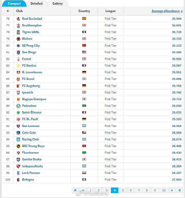 我看到一些报道称据德转统计大连英博主场场均观众人数以43115人位列亚洲第一,全球第34。但这个数据看上去似乎并不包含最新一场主场数据。事实上,德转比赛报告里的观众人数一般会延迟于比赛报告更新,这也许是报道数据有误的原因。我刚刚看了一下,新的数据目前已经更新,大连英博应该暂时是全球第17位(55352人),比曼城(18位)要高。不过,我觉得这个数据采集节点有问题,一般来说,这种综合数据,是半赛季一统计或者一整个赛季一统计,现在中超比赛轮次太少,分母太少,导致场均数每轮都会有较大幅度变动,而欧洲基本上已经联赛结束,两相对比参考性不是很强,应在15轮后或赛季结束进行统计为宜。此外,这个统计叫上座人数或现场观众人数统计,不宜叫做“上座率”。