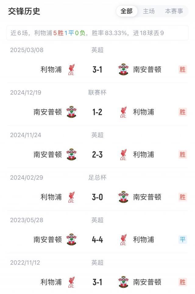 利物浦联赛5战全胜积15分暂位英超榜首,目前各项赛事6连胜;南安普顿联赛1胜3平2负积6分暂位英冠第19,近3轮联赛不胜。利物浦各赛事对阵南安普顿已9场不败(8胜1平)。
