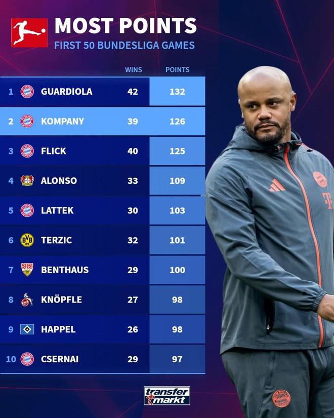 拜仁主帅孔帕尼执教德甲前50场比赛拿到126分,历史仅次于瓜迪奥拉。