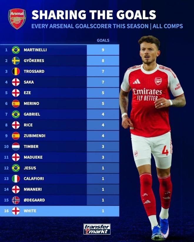 值得一提的是,凭借本场的进球,本·怀特成为了阿森纳本赛季队内第16位取得破门的球员,球队进攻端的多点开花态势十分明显。